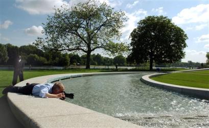 A photographer watched by a security guard lies on the waters edge of the 'Diana, Princess of Wales Memorial Fountain,' in London's Hyde Park during a press preview, Tuesday June 29, 2004. British Queen Elizabeth II will officially open the Memorial fountain to the public on July 6, 2004. [AP]