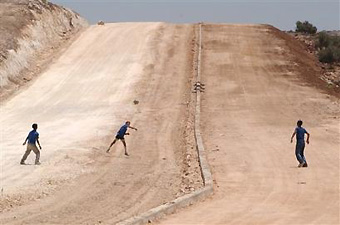Palestinian children play ball at the site where Israel started building several months ago its separation barrier in the outskirts of the West Bank village of Biddu, north of Jerusalem, Wednesday June 30, 2004. [AP]