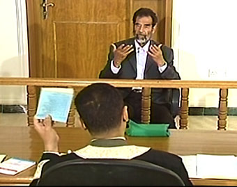 In his first public appearance since he was captured by U.S. forces in December, Saddam defended the invasion of Kuwait as being "for the Iraqi people."