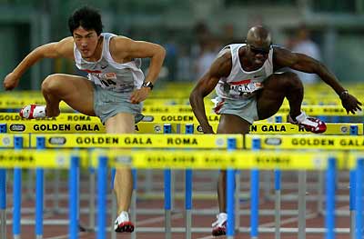 Liu Xiang of China (L) clears a hurdle on his
