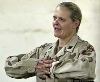 Janis Karpinski, the U.S. general who was in charge of Baghdad's notorious Abu Ghraib prison, said on July 3, 2004 she had met an Israeli interrogator in Iraq, a controversial allegation likely to irritate many in the Arab world. A U.S. military spokesman in Washington said he had no information and an Israeli official denied Israel was involved. Karpinski is pictured outside Abu Ghraib prison near Baghdad in this July 20, 2003 file photo. [Reuters]