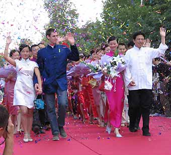 More than 30 new couples hold a group wedding in the Tuileries Gardens in downtown Paris on Saturday, when the Paris Shanghai Week opened as part of the Chinese Culture Year that ends this month. [Xinhua]