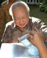 Former Indonesia strongman and President for 32 years, Suharto, casts his ballot Monday, July 5, 2004, in Jakarta. It is the first time in history that Indonesians vote directly for President. [AP]