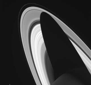 An image taken by the Cassini spacecraft on July 3, 2004 and received on Earth on the same day shows the planet Saturn casting a shadow over its rings.