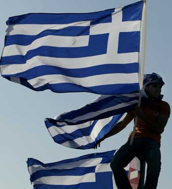 A Greek soccer fan waves the national flag as he welcomes the Greek soccer team after their arrival at the Eleftherios Venizelos International Airport in Athens, July 5 2004. [Reuters]