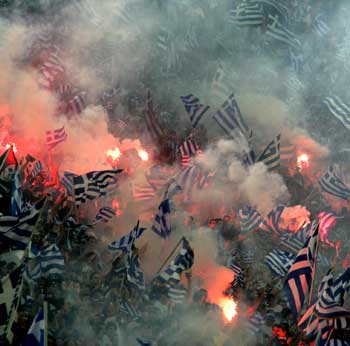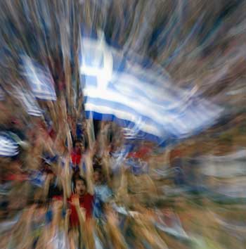 Greek fans celebrate July 5, 2004 during a welcoming ceremony for Greece's triumphant Euro 2004 soccer team in Athens' Panathenaic stadium, where the first modern Olympic Games were held in 1896. [Reuters]