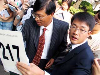 The buyer and his assistant (with bidding number) are to leave the auction site after winning the bid at 48 million yuan (about US$6 million) for the 20 pieces of oracle bones July 4, 2004. [newsphoto]