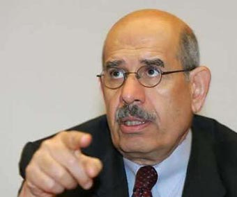 U.N. nuclear watchdog head Mohamed ElBaradei hopes to get Israel to begin talks on ridding the Middle East of nuclear weapons, whether it admits to having them or not, when he flies to the Jewish state on July 6, 2004. ElBaradei gestures prior to a closed-door meeting of the IAEA 35-nation Board of Governors, in Vienna, June 16. [Reuters]