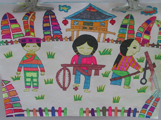 Here, the folk fine art of the Xiangxi, or Western Hunan region has been expressed by the hands of children with their special perspective. Straw dragonflies fly around the big trees, on whose branches baby dolls made from colourful cloth are attached. Below the trees are all sorts of utensils made of straw, such as brooms, baskets and bowls. The visitors are most fascinated by the different stories being told by the straw figures. Folk fairy tales and traditional holiday celebration are also the favourites of the young artists. Traditionally, paper-cuts made by Miao women are used for embroidery patterns. But nowadays, the handicraft is in danger of extinction. Fortunately, Long cherishes the art - it is her favourite subject. "The teacher does not have any particular requirement for us at all," she says. "I just cut whatever patterns I like, though sometimes he will give us a helping hand when we have difficulties." Long uses pencils to draw a Miao girl holding straws on a piece of paper, which she claims will bring a significant harvest. She wants to make her picture more beautiful, so a butterfly is added next to the girl. The paper-cut patterns created by Long and her classmates clearly reflect the Xiangxi Miao embroidery tradition, which features flowers and grasses. When looking at his students enjoying their fine art class, Long Junjia, a village teacher, recalls that two years ago, it was a great headache for him to follow textbooks to teach the class. The students could not pay for water-colour paintbrushes, which the text required. Thus, interest in the fine art class dwindled quickly. Last July, the school became one of seven in Xiangxi to be covered by the "Dandelion Action" programme, part of a three-year project for after-school fine art education. Launched by the Commission for Children's Art under the Chinese Artists' Association, the project aims at merging folk art essence and the most creative fine art education, while protecting and rescuing intangible cultural heritage. Rich tradition Xiangxi is an ancient and still very mysterious place. Ancestors of the Miao and Tujia ethnic groups settled in the region thousands of years ago. In their long history, they have created colourful folk culture and art, featuring paper-cuts, embroidery, batik, and brocade and carving. However, like almost all intangible cultural heritage products in the world, they have been eroded by modern and foreign cultures and the market economy. Wu Xiangying, a paper-cut folk artist, used to travel to Japan in the 1980s to show his craft. But nowadays, Wu is only able to survive by selling shoes at a fair. In Xiangxi, more ageing folk artists pass away each year. Others, like Wu, have to give up their beloved art for economic reasons and their children fail to pick up the skills. "If they are not rescued in time, Xiangxi's folk fine art will be lost forever," said Liu Yuxin, a researcher with the prefecture's education research institute. With the rich cultural legacy of various ethnic minorities in Xiangxi, Xie Lifang, the veteran art educator in charge of "Dandelion Action," is exploring with her colleagues a sustainable way of integrating ethnic folk art with children's fine art education. Her enlightening concept of a feasible, sustainable and practical education mode won backing from the Ford Foundation last July, which so far has 17 programmes in China focusing on rescuing intangible cultural heritage. "While emphasizing that learning fine art is deeply rooted with local culture, we enable the children to gradually attain a basic knowledge of fine art, and we try to consolidate their love of the culture of their own ethnic groups," said Xie. "Our ultimate aim is to encourage them to protect their own art and culture." Xie said she believed that only when the new generation develops a sense of protection will Chinese folk art be salvaged from the brink of extinction. She also stressed that the innovative spirit of the children must be fully encouraged during their art education. "There must be something new in the class. We are not training paper-cut craftsmen who can only strictly following traditions," said Xie. Curriculum development During last year's summer vacation, Xie joined teachers from selected experimental schools to visit the folk handicraft people in Xiangxi. This has helped enrich the fine art curriculum, she said. Xie is a tough-minded woman who impresses others with her persistence in preserving folk art. In classes, teachers only chose the types of folk fine arts that require simple tools, materials and techniques. The paper-cut, as the most influential folk art in the region, has been adopted as the elementary course for the experimental schools. At the primary school attached to the Normal College of Jishou University, located in the prefecture, the teachers found that some students had difficulty using knives and scissors in their fine art classes, preferring to tear the paper with their fingers.