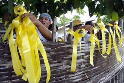 Filipino residents tie yellow ribbons outside their homes while awaiting the return of kidnapped Filipino worker Angelo de la Cruz in the Philippines' northern Pampanga province July 15, 2004. The Philippines' military awaited orders on Thursday to pull out of Iraq in a bid by Manila to save the life of the civilian Filipino hostage as the U.S. piled pressure on east Asian allies not to cave in to militants' demands. [Reuters]