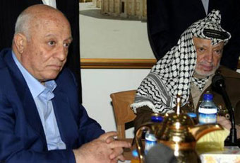 Palestinian President Yasser Arafat (R) sits next to Palestinian Prime Minister Ahmed Qurie during a meeting in the West Bank city of Ramallah July 27, 2004. [Reuters]