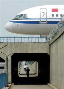 An Air China jet taxis above an underpass at Beijing airport Wednesday July 14, 2004. Airbus officials say they expect air passenger traffic in China to increase to five times their current levels in the next 20 years. [AP]