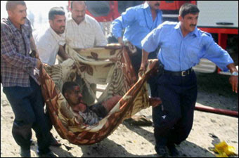 The late morning explosion wounded 56 Iraqis, overwhelming the hospital in Baqouba, a city 35 miles northeast of the capital. Every bed was filled, forcing many victims to sit on the floor amid pools of blood as frantic health workers treated them. One wounded man sitting against the wall held his head in his hands and wept. People ran through the corridors searching for information on missing relatives. "These were all innocent Iraqis, there were no Americans. What was their guilt?" one man shouted at the bomb site, pounding his head in grief. Other men screamed epithets and denounced the attackers as terrorists. The blast, one of the deadliest single-bomb attacks since Saddam Hussein's fall more than a year ago, came just three days before the country is to convene a national conference that will choose an interim assembly — considered a crucial step toward establishing democracy.
