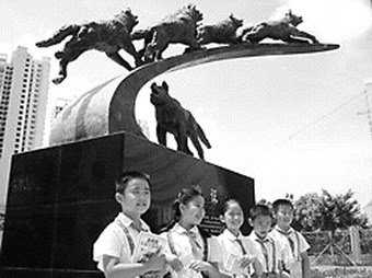 Students from Xuefu Primary School stand brfore a statue of wolves. The school is attempting to encourage students to emulate the bravery and competitive spirit of wolves. [newsphoto/file]