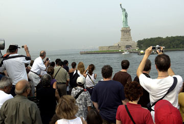 Tourists view the Statue of Liberty from a ferry boat after it was reopened in New York, August 3, 2004, with enhanced security measures. [Reuters]