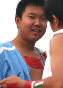 A Chinese football fan paintsflags of Iran, Bahrain and China on another fan's body before Friday evening's match. Iran beat Bahrain 4-2 to take third place inthe Asian Cup 2004. [newsphoto]