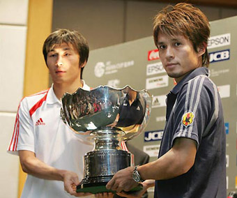 Chinese national soccer team's captain Li Weifeng and his Japanese couterpart Miyamoto pose with the Asian Cup at a press conference Friday in Beijing. China's national soccer team will have a wrestle with Japan's for the Asian Cup Saturday night. [newsphoto]