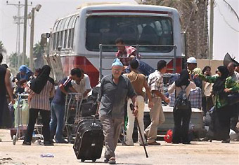 Palestinians collect their bags shortly after crossing the border between Rafah and Egypt in the southern Gaza Strip of Rafah, Friday Aug. 6, 2004. Israel reopened the Gaza-Egypt border crossing Friday, allowing some 1,500 Palestinians to head home after being stranded in Egypt for three weeks.[AP]