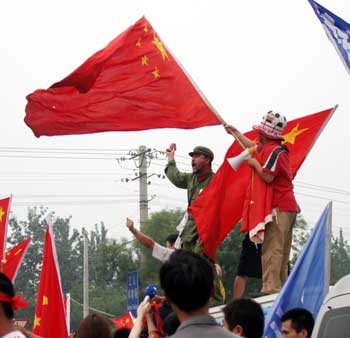 Football fans wave the Chinese national flags before the Asian Cup final between China and Japan in the Workers' Stadium in Beijing August 7, 2004. [newsphoto]