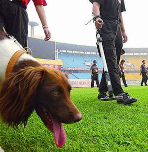 Beijing police run police dogs to check the safety of the Worker's Stadium soccer pitch in preparation for the August 7 Asian Cup final between China and Japan. [sohu]