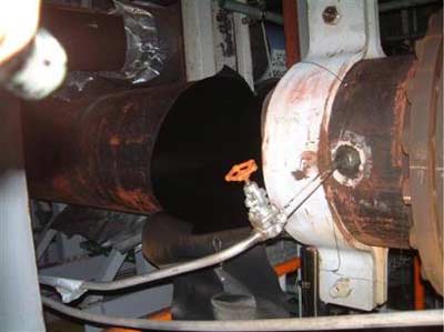 A burst pipe is seen at one of the reactors of Mihama Nuclear Power Plant in Mihama, western Japan Monday, Aug. 9, 2004. Japan suffered its deadliest nuclear power plant accident Monday when the pipe burst killing at least four workers and injured seven. No radiation was released when boiling water and steam exploded from a cooling pipe at the plant. The leak was caused by a lack of cooling water in the reactor's turbine, according to a spokesman for plant operator. [AP Photo]