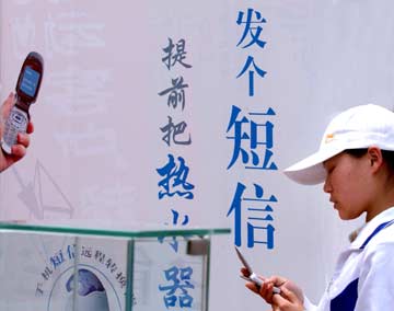 A Chinese woman sends a short message before a advertisement board in Beijing. Chinese mobile users are expected to send 550 billion short message this year, according to the Ministry of Informatino. [newsphoto]