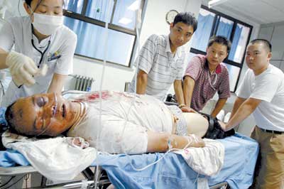 The gangsters attacked the tourists with knives and iron sticks, said witnesses. One tourists, identified as Han Kewei, was hit hard on the head by iron sticks. The other tourist suffered minor injuries on his back and arms. All the injured were sent to the Beijing Railway Hospital. Doctors said Han Kewei was still in critical conditions. The 50 tourists were from southwest China's Chongqing municipality. They were on their way home after visiting Hohhot, North China's Inner Mongolia Autonomous Region. They arrived in Beijing Tuesday morning to transfer to a flight from Beijing to Chongqing.