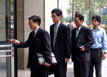 Representatives from the Democratic People's Republic of Korea (DPRK) walk into a building in New York on Tuesday local time to attend an information meeting on Northeast Asian Security and the DPRK nuclear issue. [Xinhua]