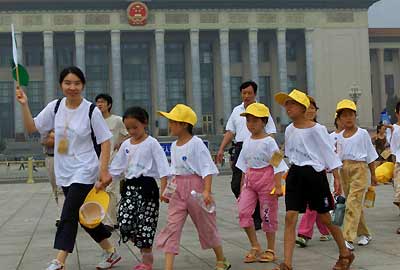 A teacher leads AIDS orphans who are attending a six-day summer camp called "Together We Grow Up" to visit Tian'anmen Square in Beijing August 10, 2004. The event, which was organized by the China Youth Concern Committee, aims to arouse public awareness about the plight of the 72 AIDS orphans. [newsphoto]