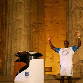 US Olympic medalist Carl Lewis raises his arms in front of the columns of the Parthenon at the Acropolis August 12, 2004. The Olympic flame will stay overnight inside the columns of the Parthenon on the eve of the opening ceremony of the Athens 2004 Olympic Games. [Reuters]