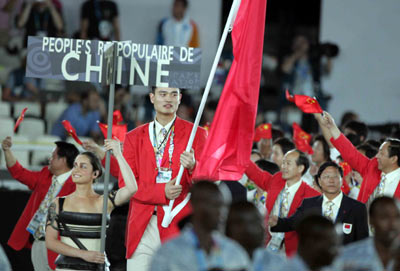 by flag bearer Yao Ming, marches into the Olympic Stadium during the