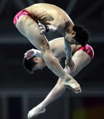Guo Jingjing and Wu Minxia from China win the women's synchronised 3m springboard finals at the Athens Olympics August 14, 2004, bringing China's golds at the Games to three. Earlier, Wang Yifu rallied to defeat Russia's Mikhail Nestruev on the final shot in the men's 10-metre air pistol competition. And Du Li won the women's 10-metre air rifle event. [Xinhua]