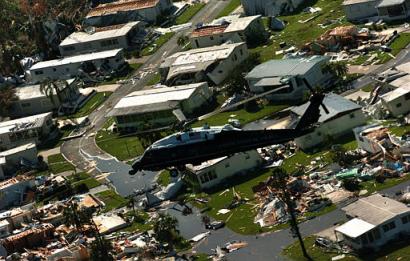 Marine One, carrying President Bush, flies over Charlotte County, Fla., to survey the destruction Sunday, Aug. 15, 2004. The area was hammered by Hurricane Charley on Friday. Charley killed at least 16 people and left thousands homeless. Bush said federal assistance was being rushed to the area. [AP]