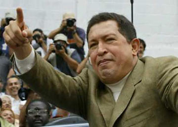 Venezuelan President Hugo Chavez points to supporters after casting his vote in a referendum on his rule in Caracas, August 15, 2004. Both Chavez, a firebrand nationalist who has ruled since 1998, and his opponents have predicted they will win the referendum.  [Reuters]