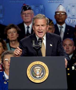 US President Bush addresses the Veterans of Foreign Wars Convention in Cincinnati, Monday, Aug. 16, 2004. Bush on Monday announced plans to shift as many as 70,000 U.S. troops who are now stationed in Western Europe and Asia in one of the largest realignments since the end of the Cold War. [AP Photo]
