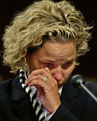 Kristen Breitweiser, whose husband Ron died in the Sept. 11, 2001, terror attacks at the World Trade Center, wipes away a tear while listening to the testimony of another panelist during a hearing by the Senate Governmental Affairs Committee, on Capitol Hill in Washington, Tuesday, Aug. 17, 2004. Breitweiser, an attorney from Middletown Township, N.J., said the work of Congress on correcting intelligence problems is still incomplete. [AP]
