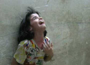 Mays, an Iraqi Shi'ite girl, cries after a