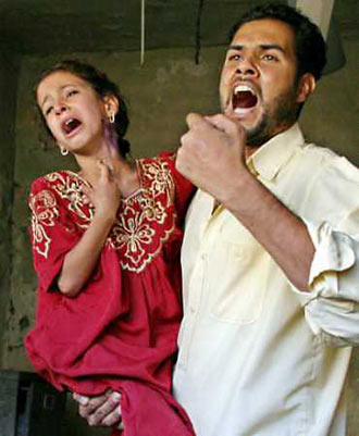 An Iraqi girl, carried by her uncle, grieves