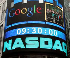 A ceremony with Google and Nasdaq executives is shown on a large screen at the Nasdaq MarketSite in New York, August 19, 2004. Shares of Google Inc. will make their Nasdaq stock market debut after the year's most anticipated initial public offering priced far below initial estimates, raising $1.67 billion.  [Reuters]