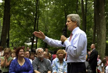 US Democratic presidential nominee, Sen. John Kerry, D-Mass., speaks to people during a front porch visit in Derry, N.H. on Thursday, Aug. 19, 2004. [AP]