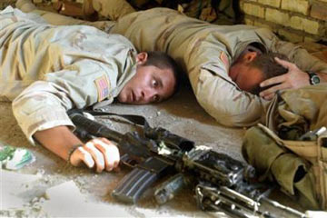U.S. Army soldiers take cover in a fortified position in Najaf, Iraq Friday, Aug. 20, 2004. Later on Friday, militiamen loyal to rebel Shiite cleric Muqtada al-Sadr removed their weapons from the revered Imam Ali Shrine in Najaf as part of an effort to end 2-week-old uprising centered on the holy site. [AP]