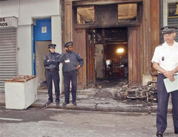 Flames gnawed away the wooden doors and blackened the walls of the center, a meeting place for the elderly and disadvantaged located on the ground floor of a six-story building. Rescue workers said the center was gutted.
