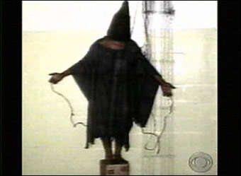A hooded Iraqi prisoner with wires attached to his hands is forced to stand on a box at the Abu Ghraib prison. [AFP]