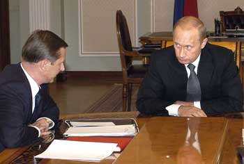 Russian President Vladimir Putin and Defence Minister Sergei Ivanov (R) meet in Moscow's Kremlin, August 27, 2004. Experts have found traces of explosives in the wreckage of the Tupolev Tu-154 passenger airplane which crashed in southern Russia on Tuesday with more than 40 people on board, Itar-Tass news agency reported. [Reuters]