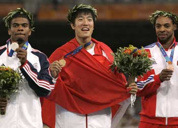 Terrence Trammel of the US, China's Liu Xiang and Cuba's Anier Garcia (L-R) pose on the podium during the medal ceremony of the men's 110 metres hurdle final at the Athens 2004 Olympic Games August 27, 2004. Liu took the Olympic men's 110 metres hurdles gold medal, equalling the world record time of 12.91 seconds and becoming the first Chinese man to win an Olympic track and field title. [Reuters]