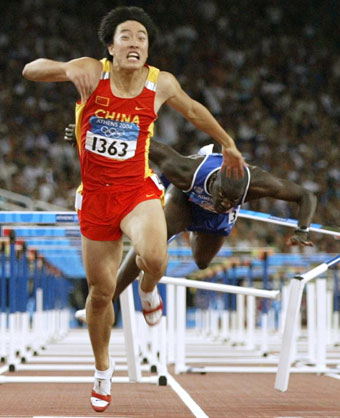 China's Liu Xiang celebrates as he crosses the finish line to win the men's 110 metres hurdle final ahead of France's Ladji Doucoure at the Athens 2004 Olympic Games August 27, 2004. China's Liu Xiang won gold in a time of 12.91 seconds, ahead of Terrence Trammel of the U.S. and Cuba's Anier Garcia. [Reuters]