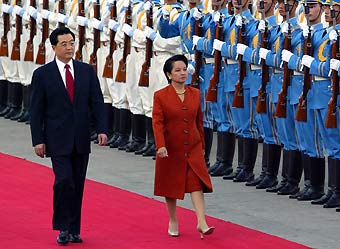 President Hu Jintao and visiting Philippine President Gloria Macapagal Arroyo pass a honour guard during a welcome ceremony at the Great Hall of the People Wednesday in Beijing. [newsphoto]