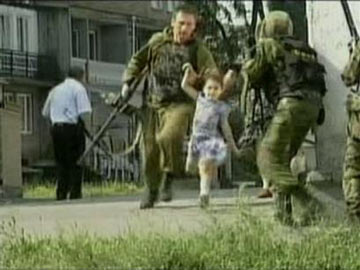 Russian soldiers rescue an unidentified child in North Ossetia Wednesday morning Sept. 1, 2004. More than a dozen attackers carrying guns and wrapped in suicide-bomb belts seized a school in the Russian region of North Ossetia Wednesday morning and were holding hundreds of hostages, including some 200 children, news reports said. [AP]