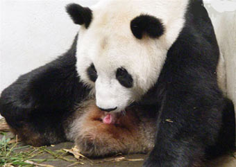 A photo taken on September 1, 2004 shows giant panda Hua Mei giving birth to a cub at the Wolong Giant Panda Protection and Research Center in Southwest China's Sichuan Province. Hua Mei gave birth to twins Wednesday night that weighed 157 grams and 130 grams respectively. Hua Mei was born in the San Diego Zoo in the United States in 1999 and was returned to China last February. It is the first giant panda born abroad and later returned to China. [Xinhua]