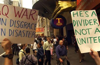 Anti-Bush protestors hold up signs outside New York's Madame Tussaud's Wax Museum, where the New York delegation to the Republican National Convention were holding a reception on Thursday, Sept 2, 2004. [AP]